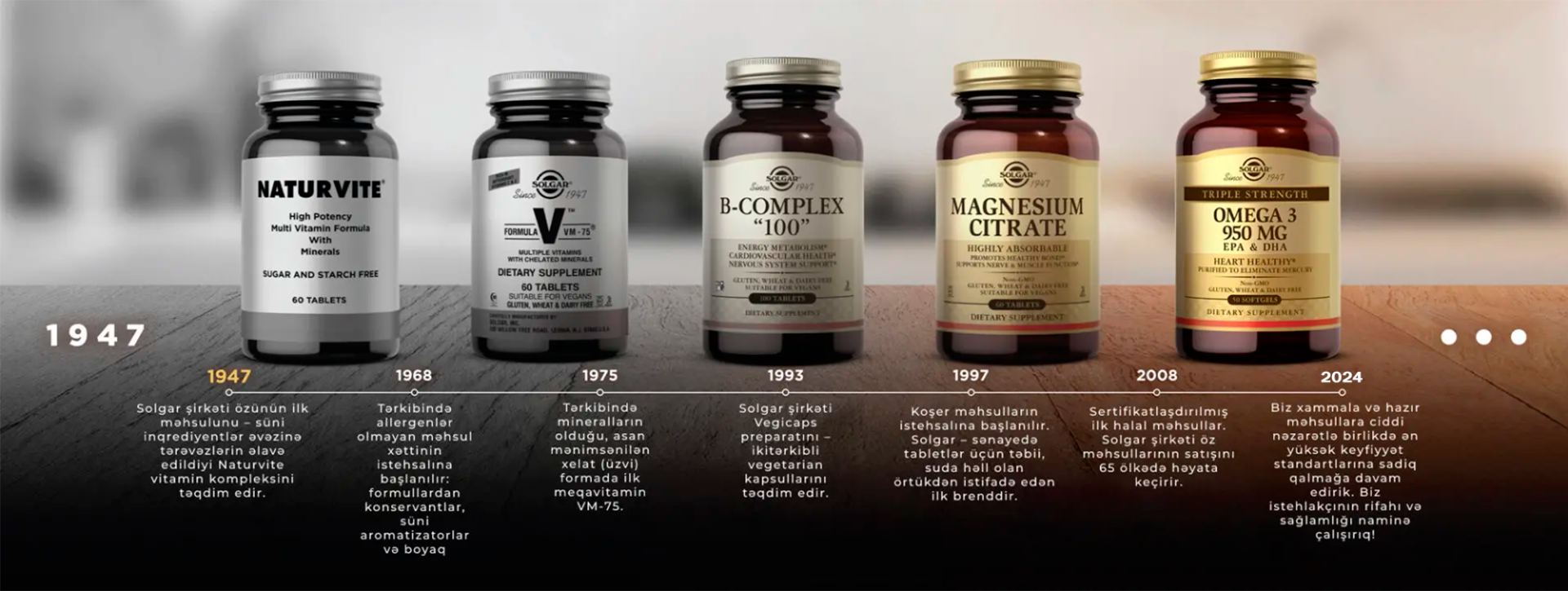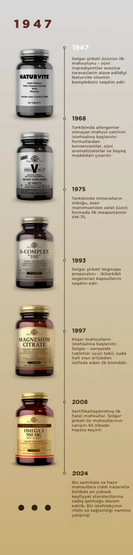 Solgar şirkətinin istehsalı olan hər bir kəhrəba rəngli flakonda qızılı rəngli qapaq altında onilliklər boyu davam etmiş zəhmət tələb edən tədqiqatlar, qabaqcıl elmi nailiyyətlər və sağlam həyat tərzinə sarsılmaz sadiqlik barədə tarixçə saxlanılır.